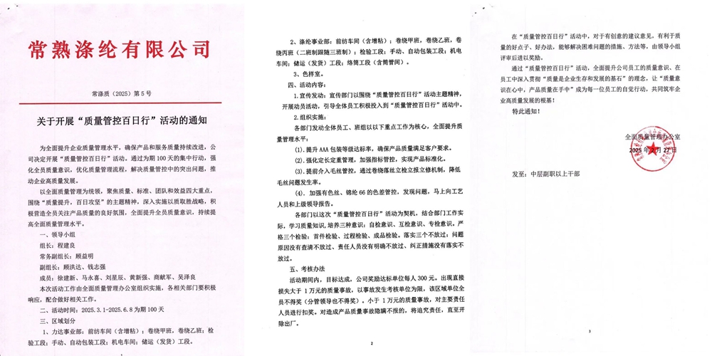 A "Minőség -ellenőrzési száz napi kampány" 2025. március 1 -jén történő elindítása óta a Changshu Poliészter a "Minőségjavítás, Száznapos kampány" témájával rögzítette átfogó minőségi menedzsment céljait, és több dimenzió és intézkedés révén meghúzta a minőségi "biztonsági szelepet". Az adatok azt mutatják, hogy a két üzleti egység panaszának száma a rendezvény során jelentősen csökkent a tavalyi évhez képest, és jelentősen javult a minőségi tudatosság és a folyamat optimalizálása.